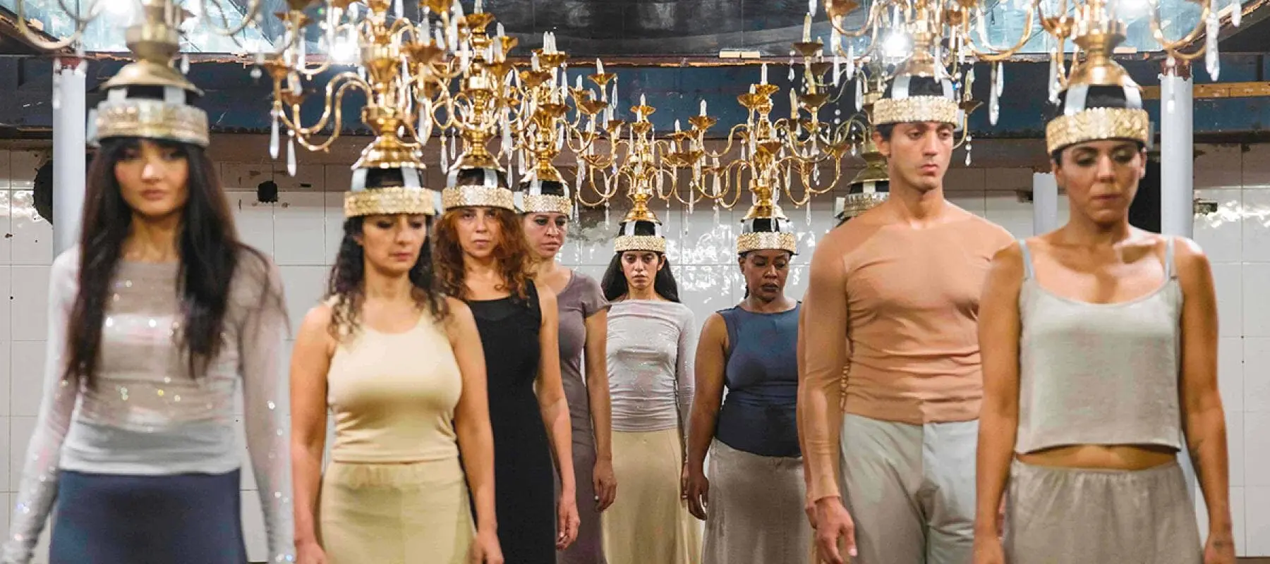 Nine dancers, balancing candlesticks on their heads, move in solemn unison, blending 1920s folk traditions with contemporary expression. Set to a haunting soundscape by Ismail Hosny, the choreography sheds ceremonial formality to explore the deconstruction of stories, bodies, and motion. The result is a powerful meditation on collective presence, burden, and balance—where synchronized movement becomes a quiet act of resistance.